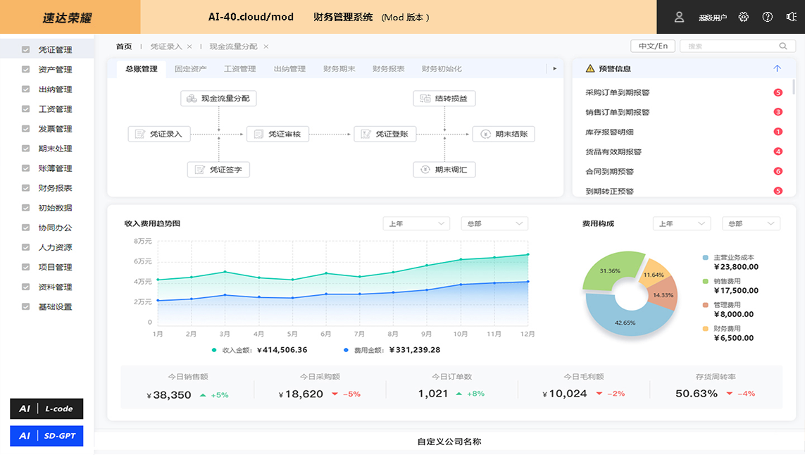 《AI-40.cloud_XP》 财务管理(AI) 系统是速达软件公司的高端应用解决方案,完整涵盖中小企业管理应用。深度引入 AI 智能技术和全新企业管理解决方案思想。智能 AI 的引入高效易行的帮助企业个性化应用,辅助智能思想模型的实现,低代码编程 、多语言应用、数据接口开放、GPT 智能模型都是全新的管理软件核心思想,为用户带来便捷的应用和科学的管理。支持桌面部署、云部署相互兼容。