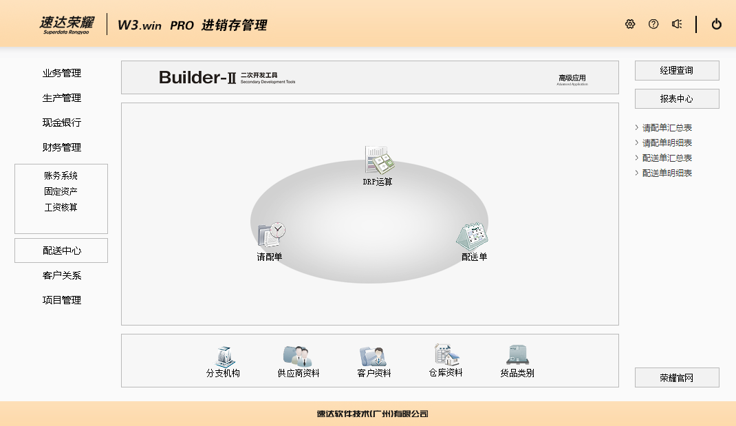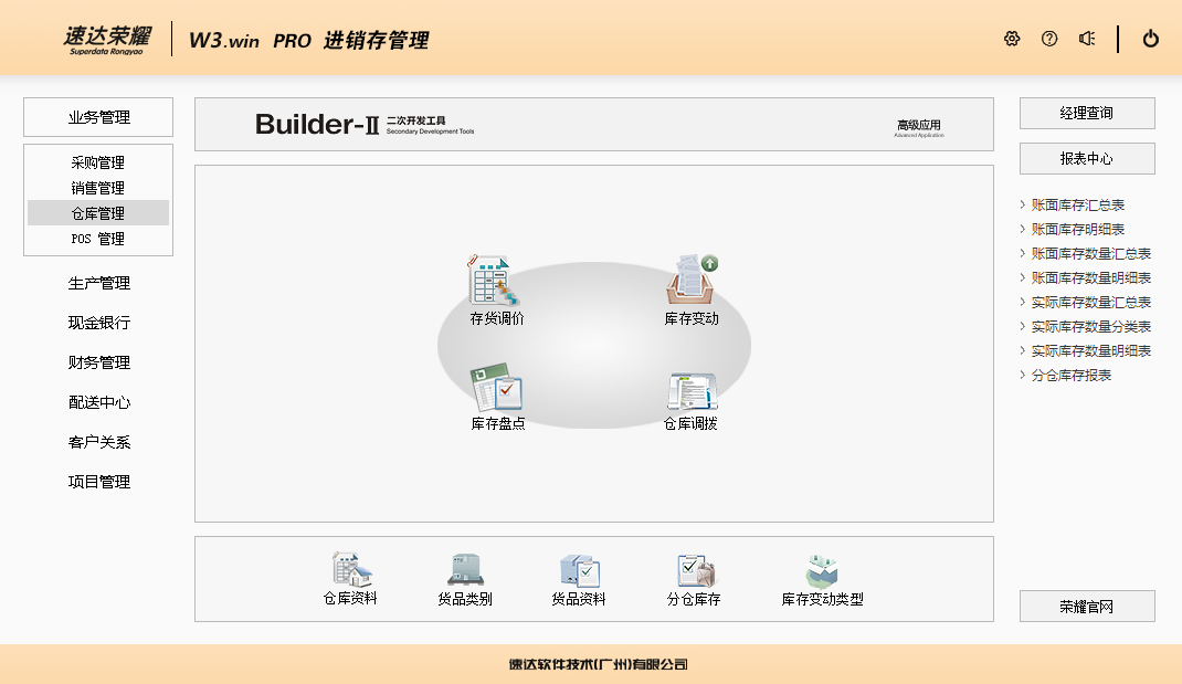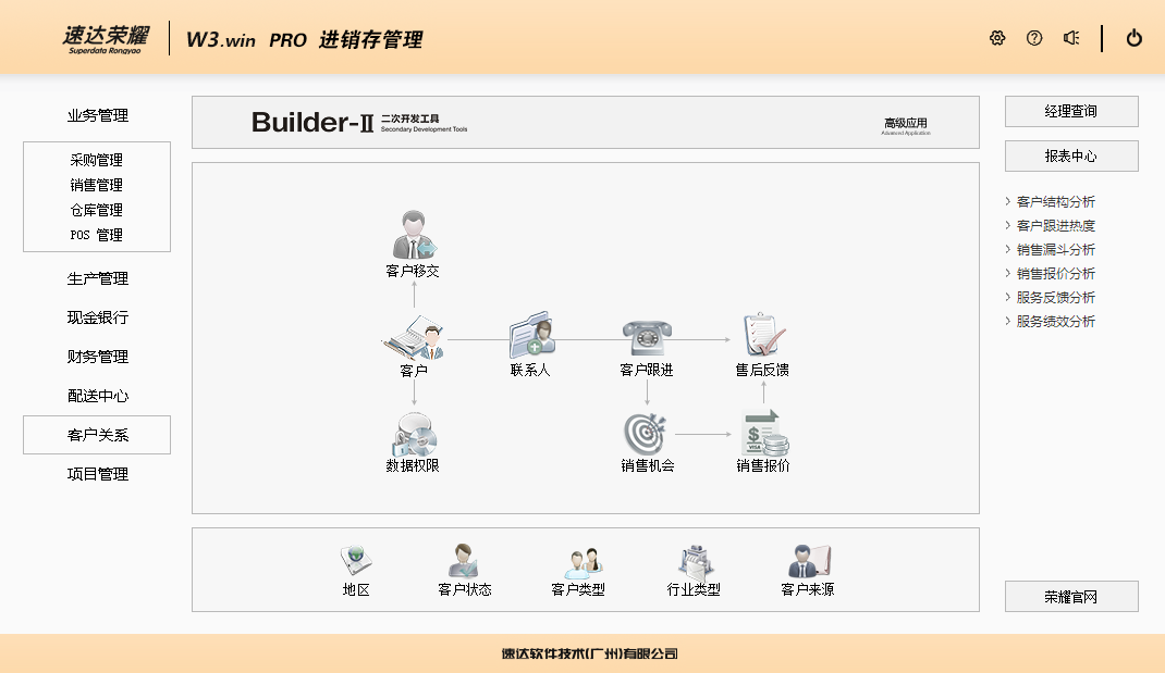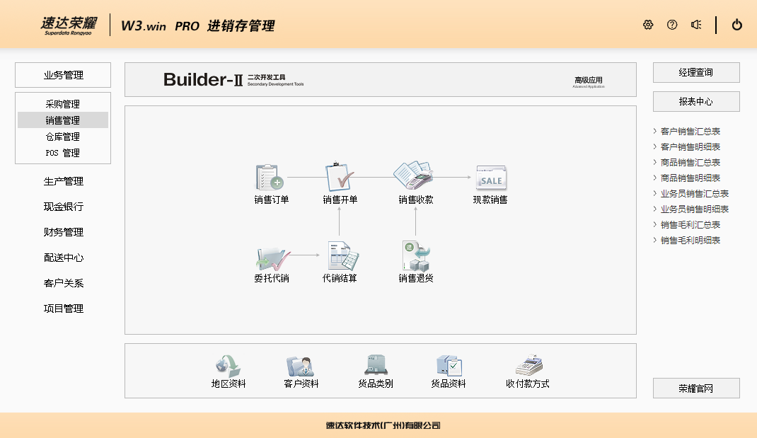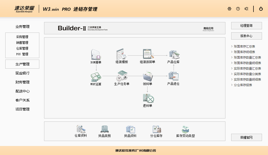 速达荣耀 W3.win PRO 集进销存、POS、财务、生产、CRM为一体的中小企业管理软件。软件支持云部署和桌面服务器部署及APP部署,并科学地融入Builder-II二次研发工具,满足企业管理的个性化需求,大大提升了应用效率和安全性。 软件支持局域网/互联网多用户应用,实现异地多机构、多店面、多仓库等远程应用,支持APP移动端应用,数据实时同步,安全、稳定、高效、易维护,特别适合中小企业使用。