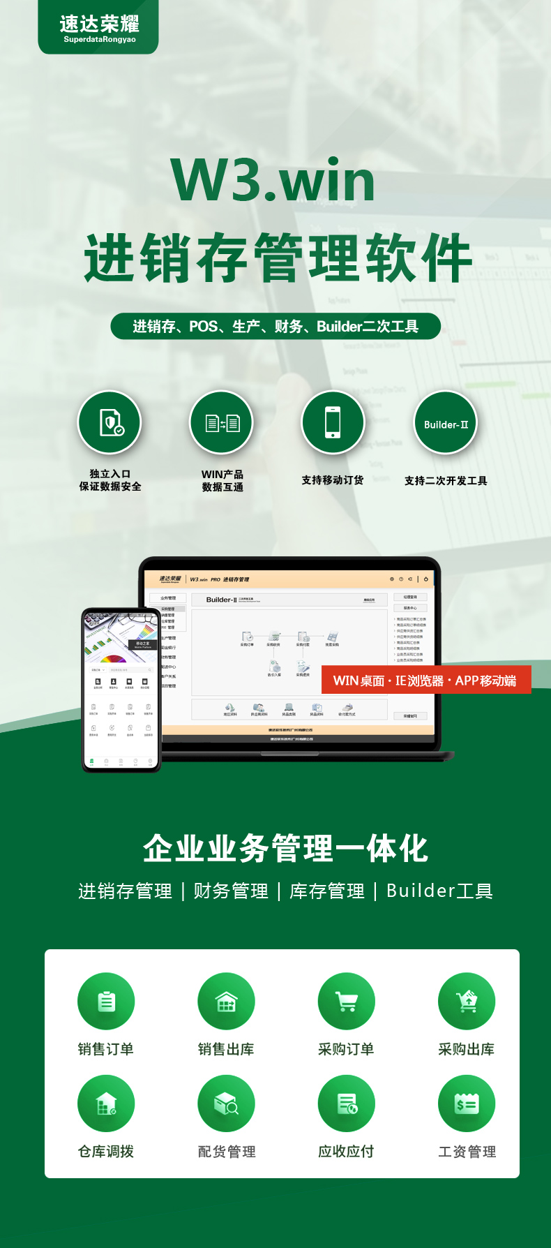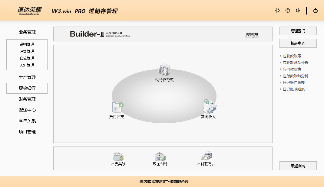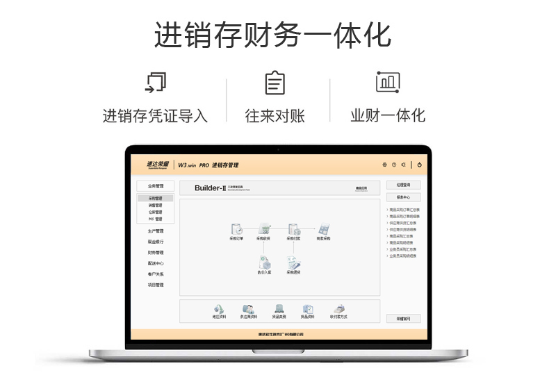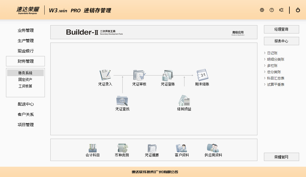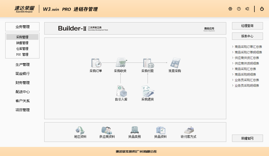 速达荣耀 W3.win PRO 集进销存、POS、财务、生产、CRM为一体的中小企业管理软件。软件支持云部署和桌面服务器部署及APP部署,并科学地融入Builder-II二次研发工具,满足企业管理的个性化需求,大大提升了应用效率和安全性。 软件支持局域网/互联网多用户应用,实现异地多机构、多店面、多仓库等远程应用,支持APP移动端应用,数据实时同步,安全、稳定、高效、易维护,特别适合中小企业使用。