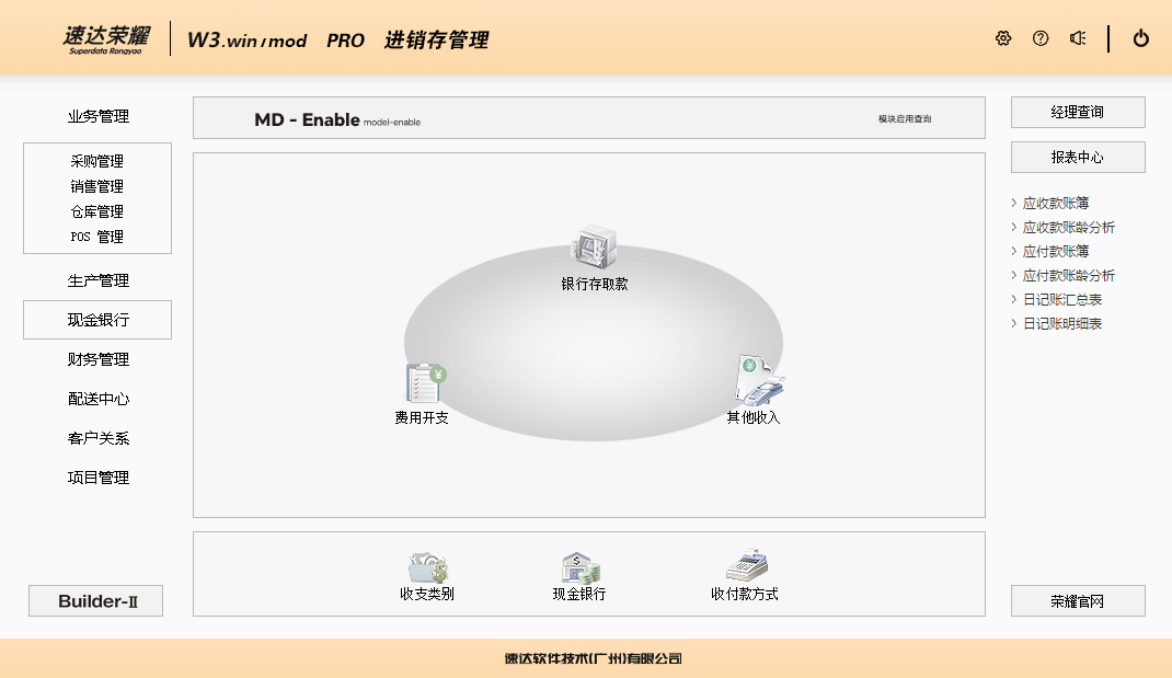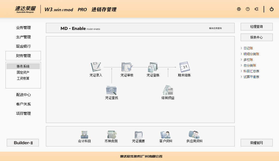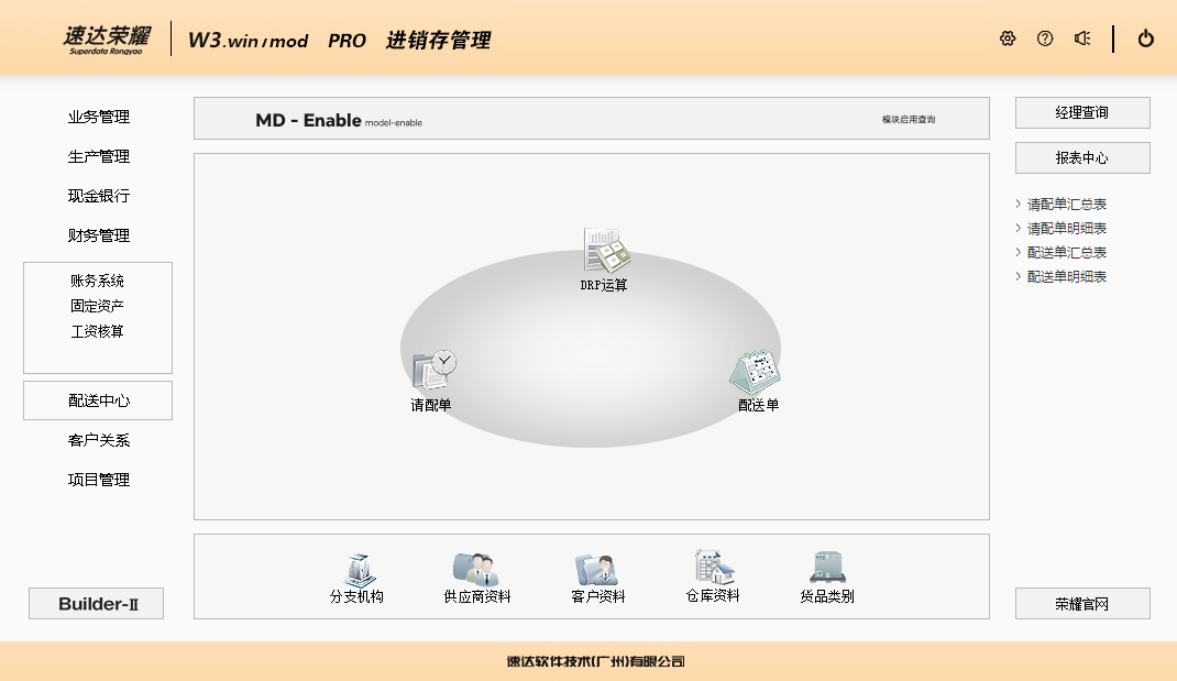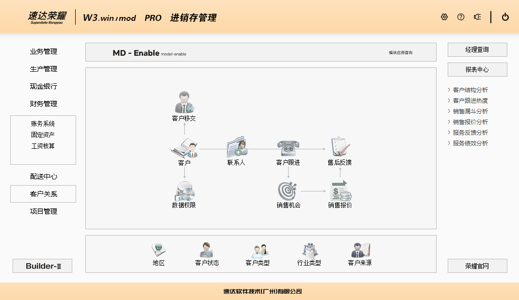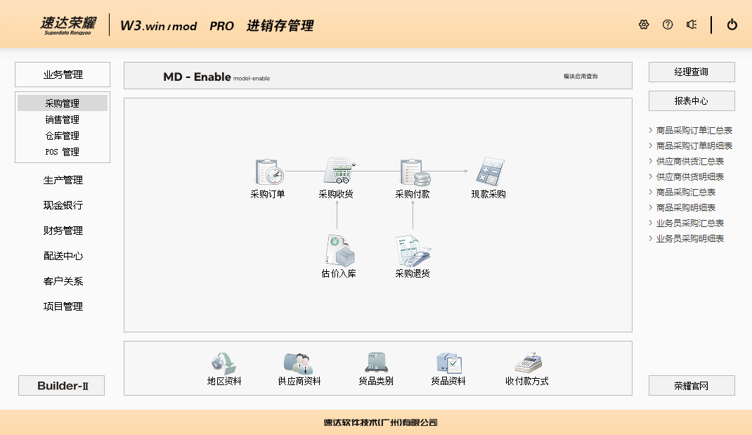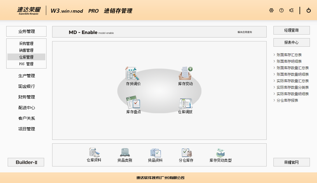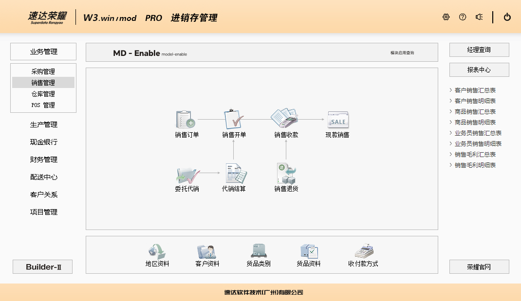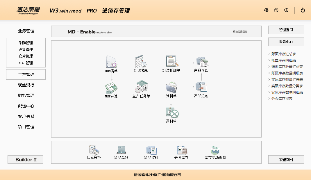 速达荣耀 W3.win/mod PRO 集进销存、POS、财务、生产、CRM为一体的中小企业管理软件。软件支持云部署和桌面服务器部署及APP部署,并科学地融入Builder-II二次研发工具,满足企业管理的个性化需求,大大提升了应用效率和安全性。 软件支持局域网/互联网多用户应用,实现异地多机构、多店面、多仓库等远程应用,支持APP移动端应用,数据实时同步,安全、稳定、高效、易维护,特别适合中小企业使用。