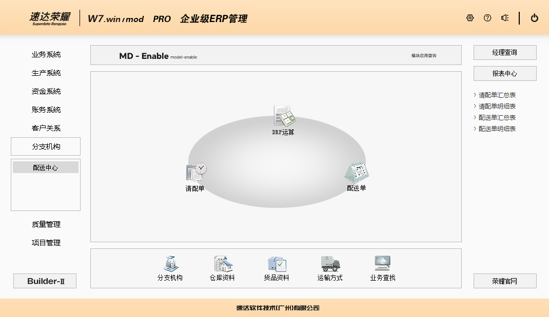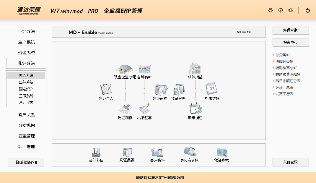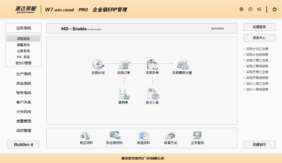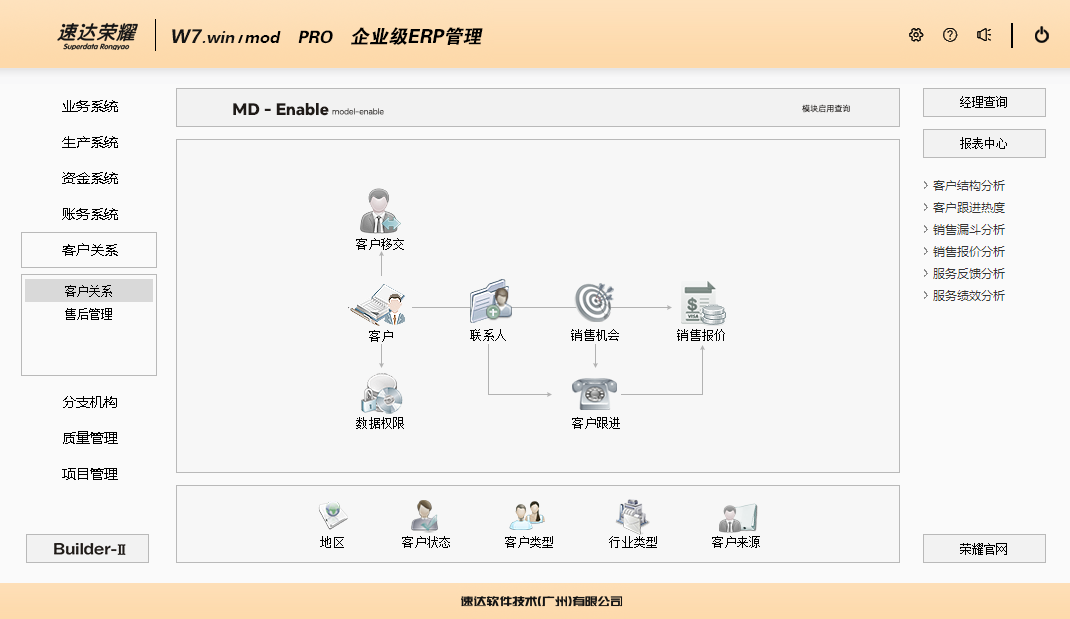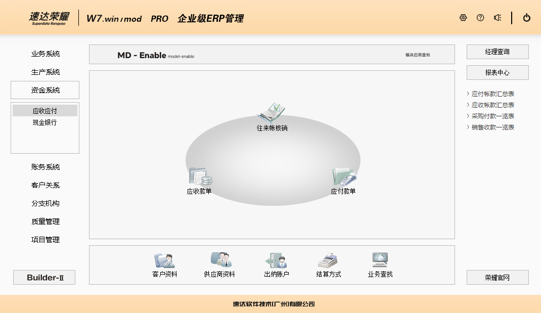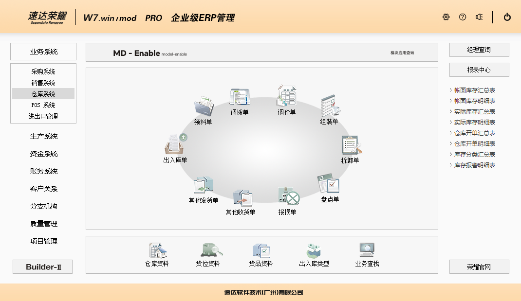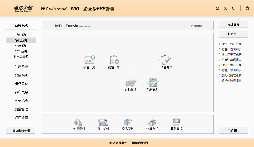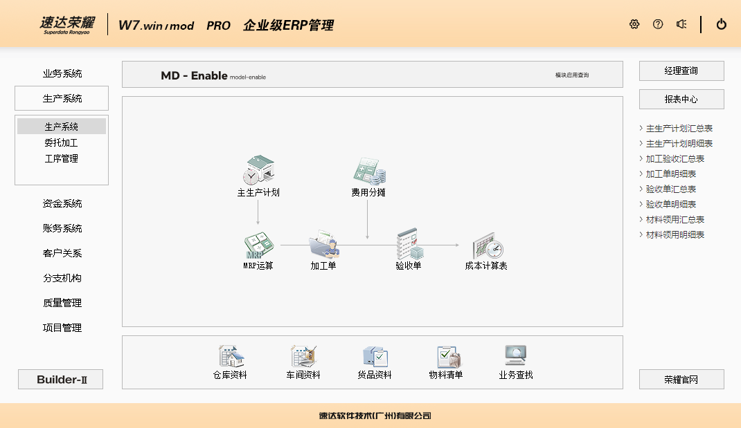 《速达荣耀 W7.win/mod PRO》管理系统是中型企业全周期管理完整解决方案。内置的 Builder-II 二次开发工具,高效易行的帮助企业实现个性化应用,系统集采购管理、销售管理、仓库管理、POS管理、资金管理、集团应用....为主应用模块,支持按需配置功能模块,构建一体化企业管理平台,降低企业管理成本、提升工作效率。 系统支持局域网 / 互联网多用户应用,实现异地多机构、多店面、多仓库等远程应用。同时支持 APP 移动端应用,数据实时同步,安全、稳定、高效、易维护,特别适合中型企业使用。