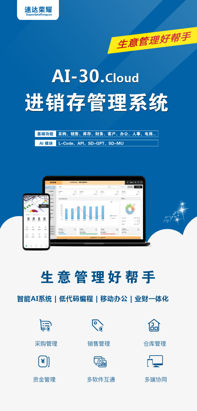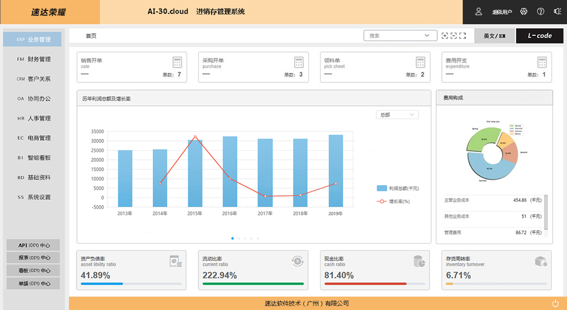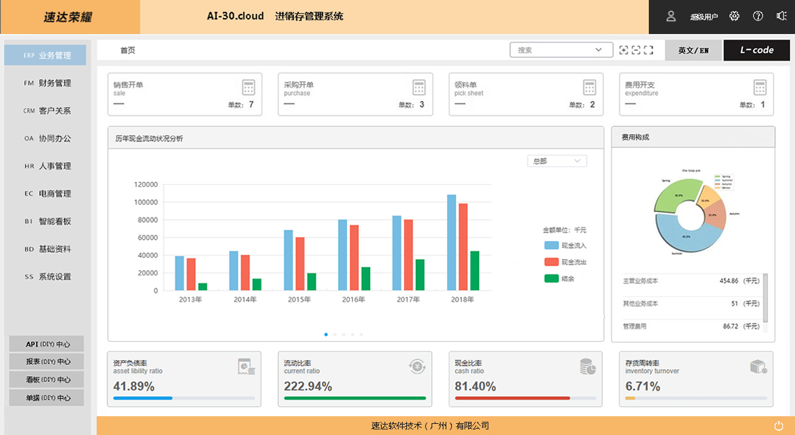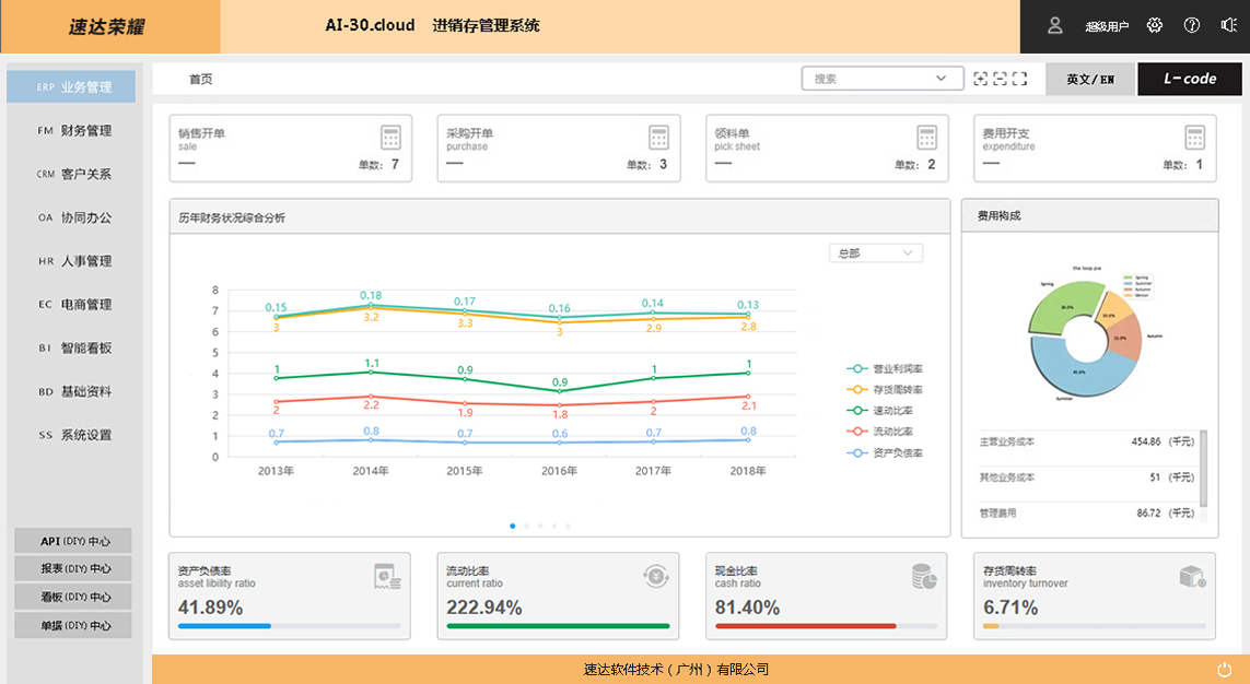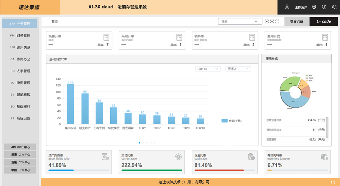 速达荣耀 AI-30.Cloud 企业管理系统是速达软件公司的高端应用解决方案,完整涵盖中小企业管理应用。 深度引入 AI 智能技术和全新企业管理解决方案思想。智能AI的引入高效易行的帮助企业个性化应用,辅助智能思想模型的实现,低代码编程 、多语言应用、数据接口开放、GPT 智能模型都是全新的管理软件核心思想,为用户带来便捷的应用和科学的管理。支持桌面部署、云部署相互兼容。