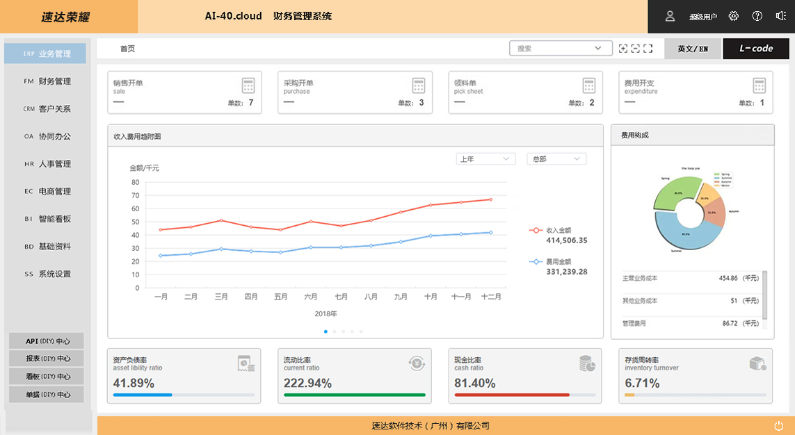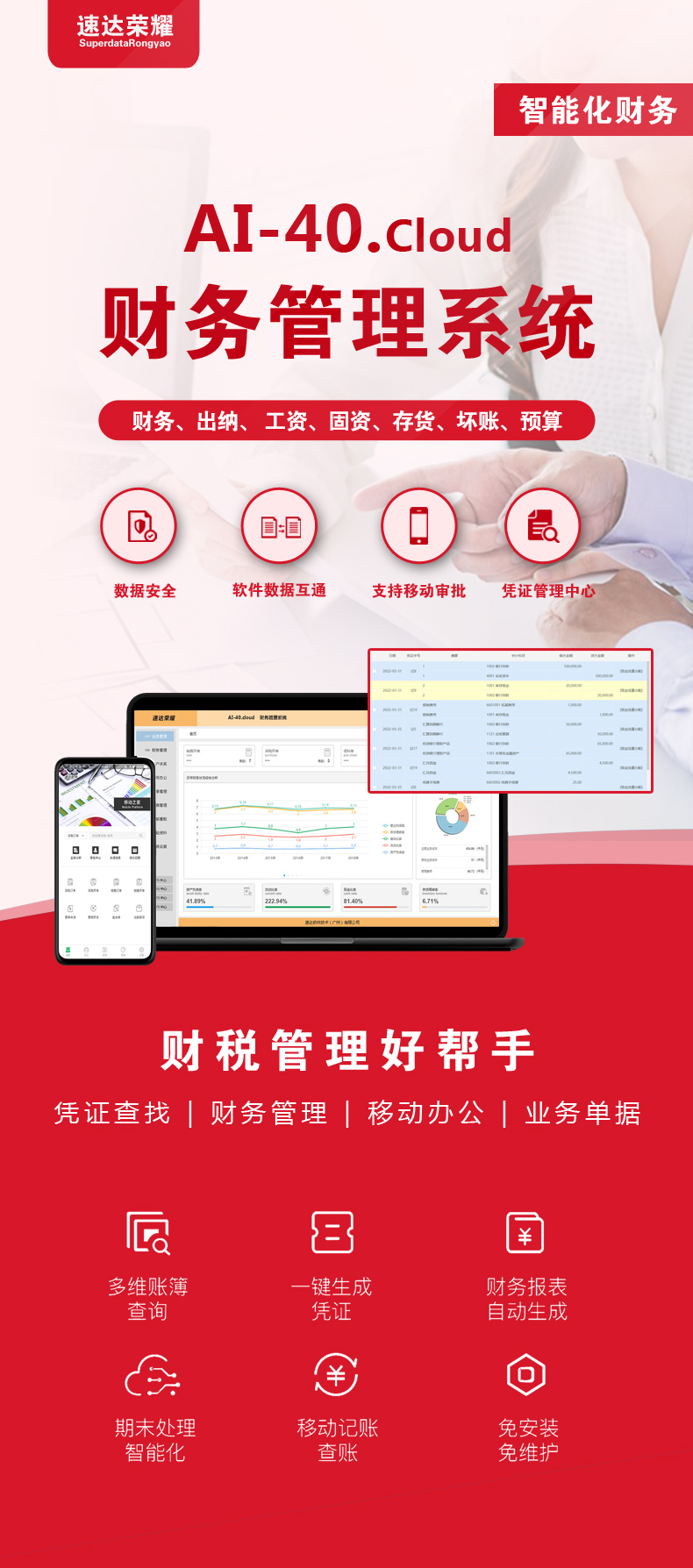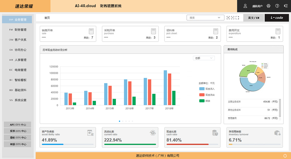 速达荣耀 AI-40.Cloud XP《财务管理系统》 是一套完整的财务管理信息解决方案。有机的将固定资产、工资管理、出纳管理、总账管理、账务期末集成为一体,数据共享、穿透、汇总。